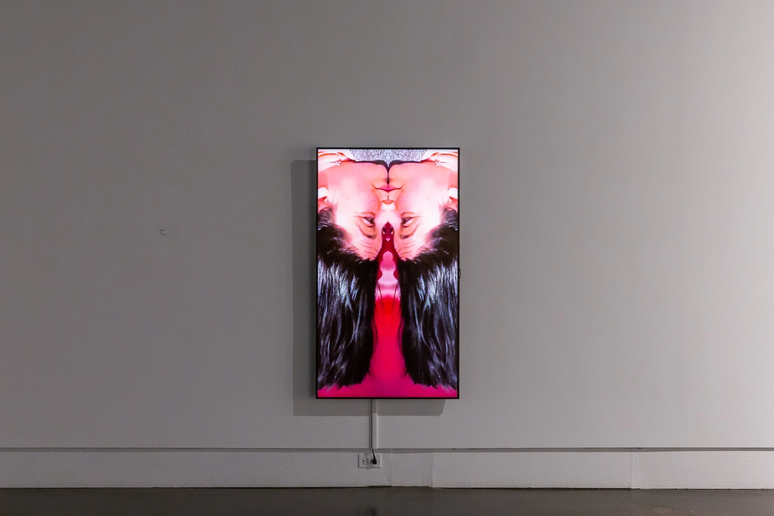 A mirrored image of a performance artist from the shoulders up. The female figure has shoulder-length dark hair and brown eyes. She is wearing a grey sweater, which can partially be seen at the top of the screen. She is hanging upside down. The heads are facing one another, creating the illusion of two identical faces nearly touching nose-to-nose against a red background. Throughout the piece, the artist repeatedly vocalizes the word 'no/know'.