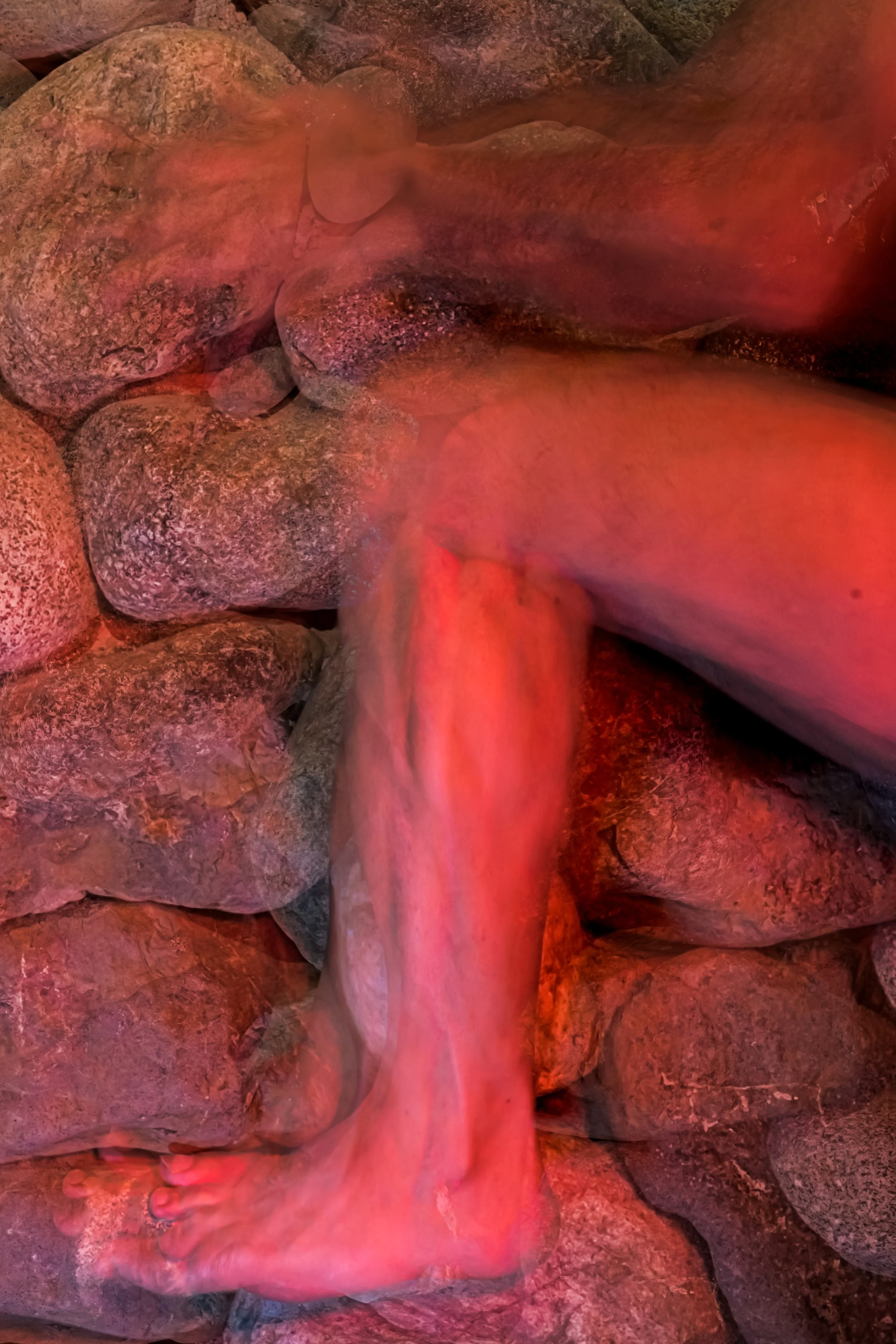 Round rocks form a wall. A bare blurry leg and arm are against the stone wall. The skin tones and lower right rocks are lit reddish from a light coming from the bottom right of the image.