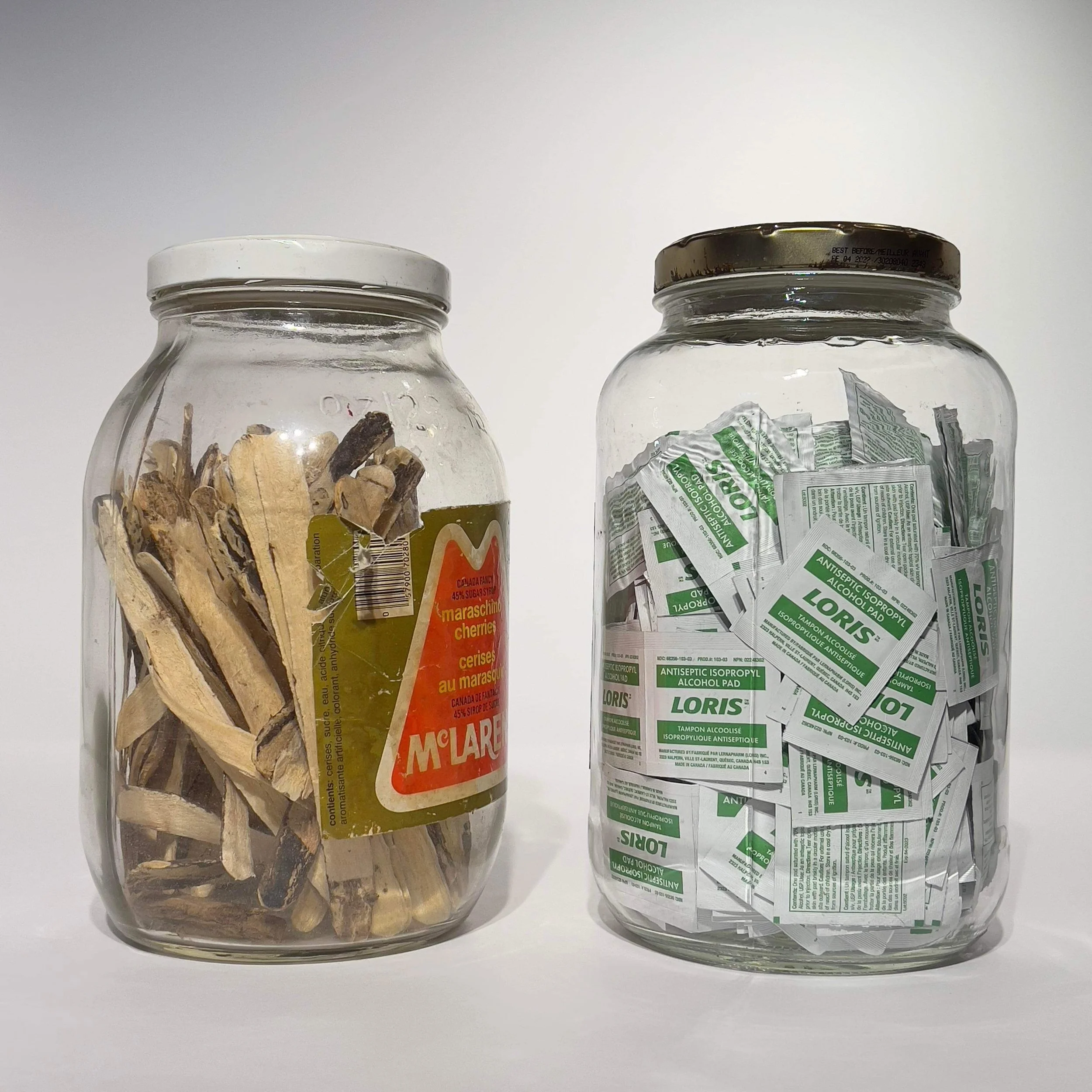 medicine and ancient Chinese herbal practices within the intimate space of caregiving. Created while caring for Don Kwan’s aging parents, the images place traditional remedies, ginseng, dried orange peels, roots, alongside medical alcohol pads, bandages, and other current day pharmaceutical objects. Many of these jars and ancient remedies have occupied his family’s kitchen cabinets since Kwan’s childhood, forming a quiet, ever-present archive of care, belief, and survival.